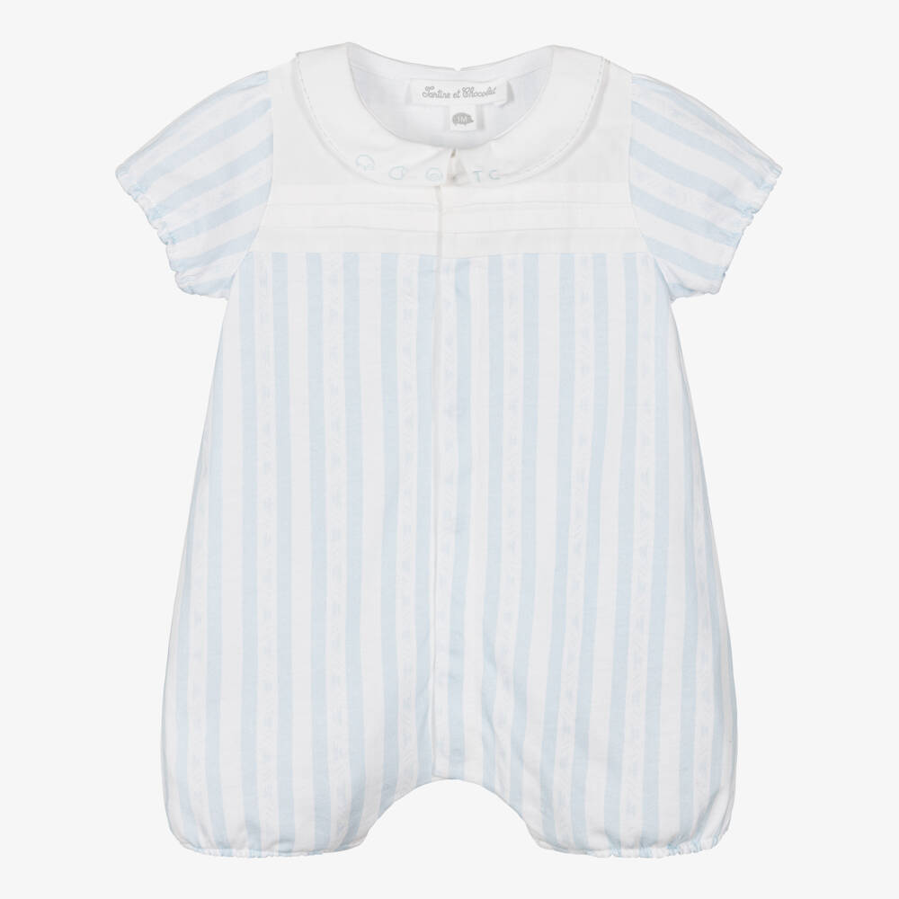 A white shortie for baby boys and girls by Tartine et Chocolat. Striped in blue and delicately patterned, it is made in gentle-on-the-skin cotton jersey, with smart pin tucks on the front. This short-sleeved babysuit has a woven collar enhanced by subtle logo embroidery and adorable stitched hedgehogs. It fastens with concealed poppers on the front and between the legs to help with dressing. The sleeve and leg cuffs are gently elasticated for comfort and shape.