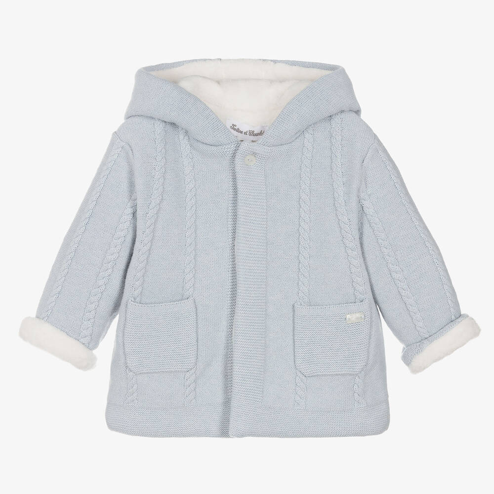 Cosy blue pram coat for baby boys and girls by French brand Tartine et Chocolat. Knitted in a luxurious wool, cashmere and cotton blend, this sweet style has a fixed hood and a traditional cable knit design. It fastens with a logo button and concealed poppers on the front, and is fully lined in snuggly plush for warmth.