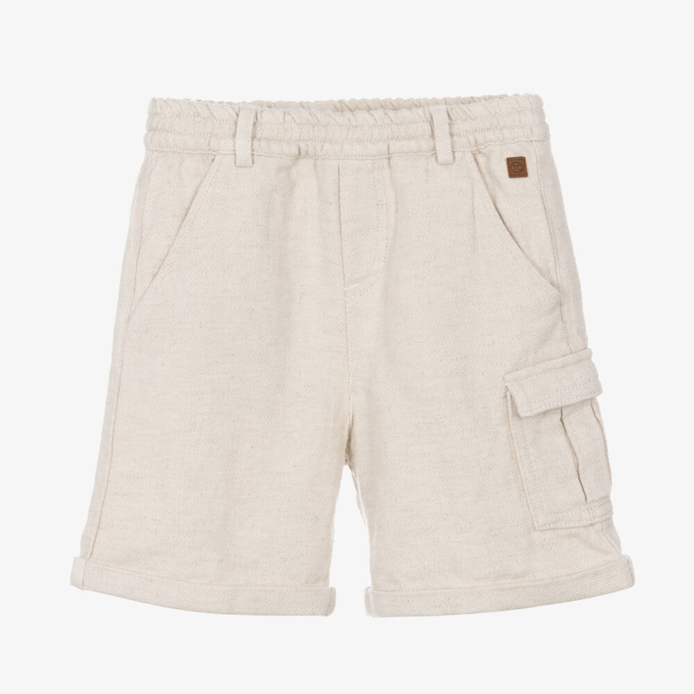 Beige cargo shorts for boys by French brand Tartine et Chocolat, made in a soft, woven cotton and linen blend. They are elasticated around the waist for easy and practical pull-on. They have slanted front pockets with a brown logo badge on one side, a cargo pocket on one leg and fixed turned-up cuffs.