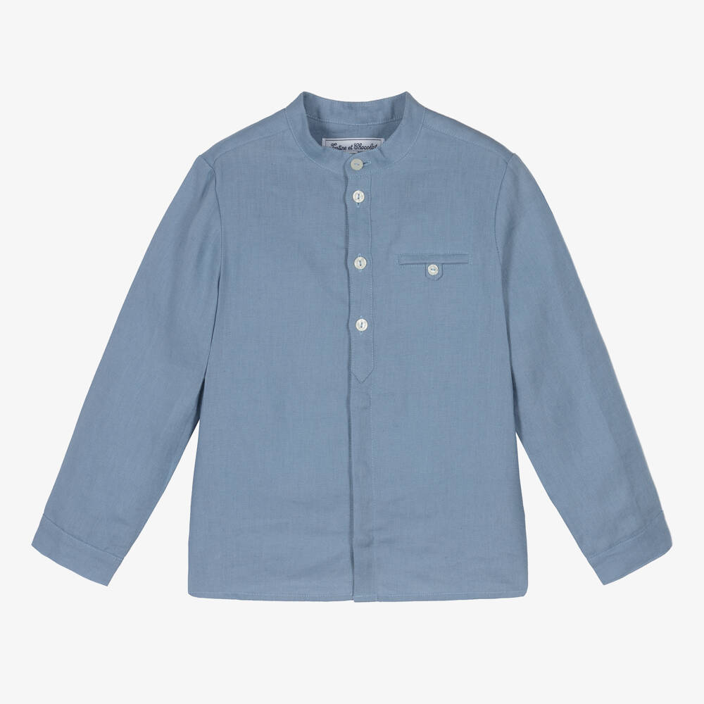Cobalt blue collarless shirt for boys by Tartine et Chocolat. Cool and comfortable, this lightweight linen shirt has a faux chest pocket and branded button fastenings on the front.