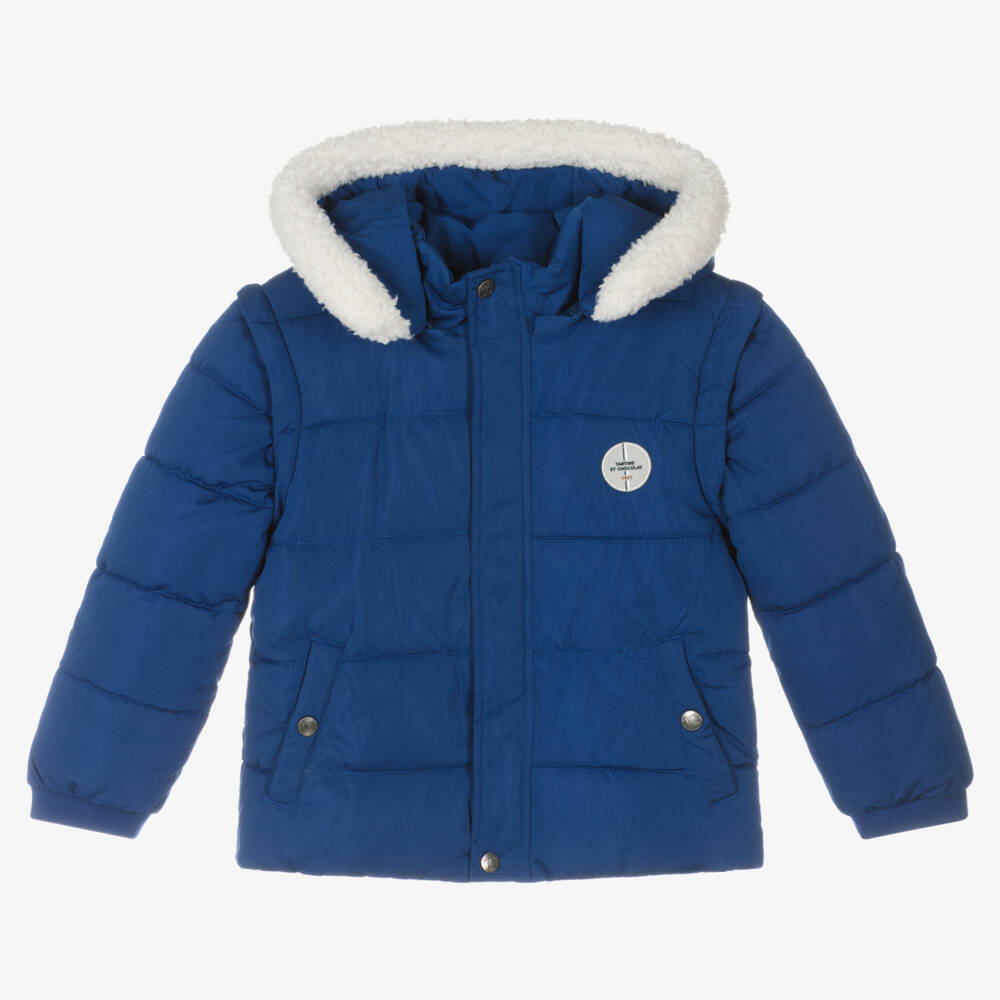 A blue puffer coat for boys by Tartine et Chocolat, with a rubberised logo badge on the chest. A timeless layering piece, it has a removable hood with a faux fur trim and detachable arms that transform the coat into a gilet. There are pockets that secure with poppers and a super soft cotton jersey lining. The coat fastens with a zip and popper fastening placket.