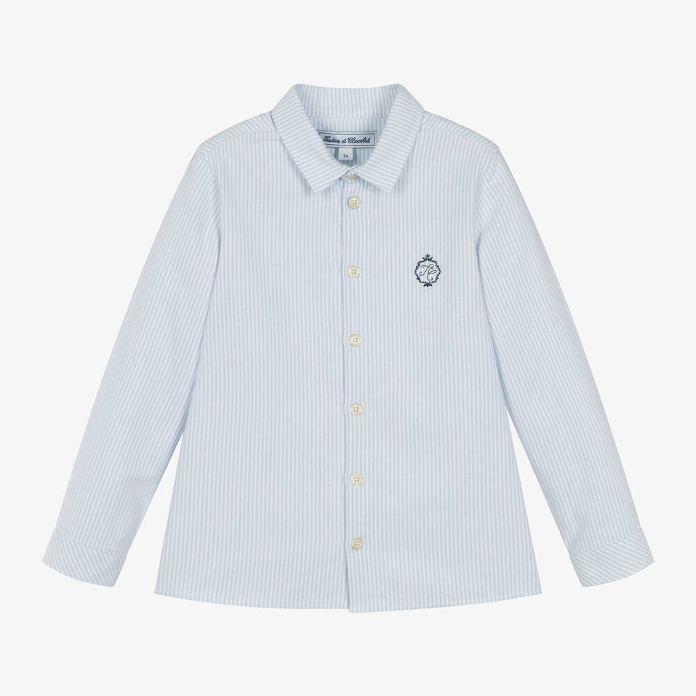 Blue and white striped shirt for boys by French brand Tartine et Chocolat, made in super soft brushed cotton. This long-sleeved shirt has a navy blue embroidered logo on the chest and branded button fastenings on the front and cuffs.