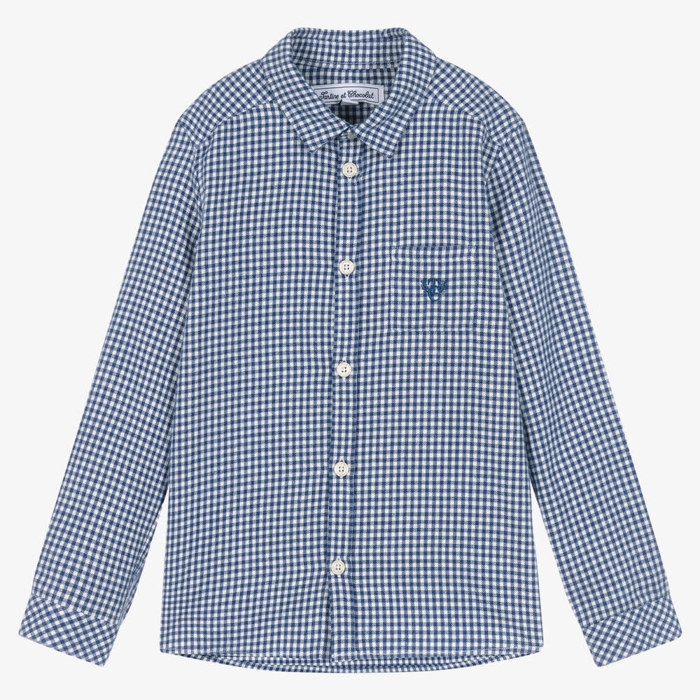 Casual blue and white gingham-checked shirt for boys by Tartine et Chocolat, made in soft and comfortable brushed cotton. It has a small patch pocket on the chest with a navy blue embroidered logo and there are branded button fastenings on the front and cuffs.