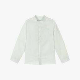 Patterned with fine green stripes, this lightweight shirt for boys by Tartine et Chocolat, is made in a soft cotton and linen blend. A classic collarless style, it features buttoned cuffs on the long sleeves, subtle logo embroidery and branded button fastenings.