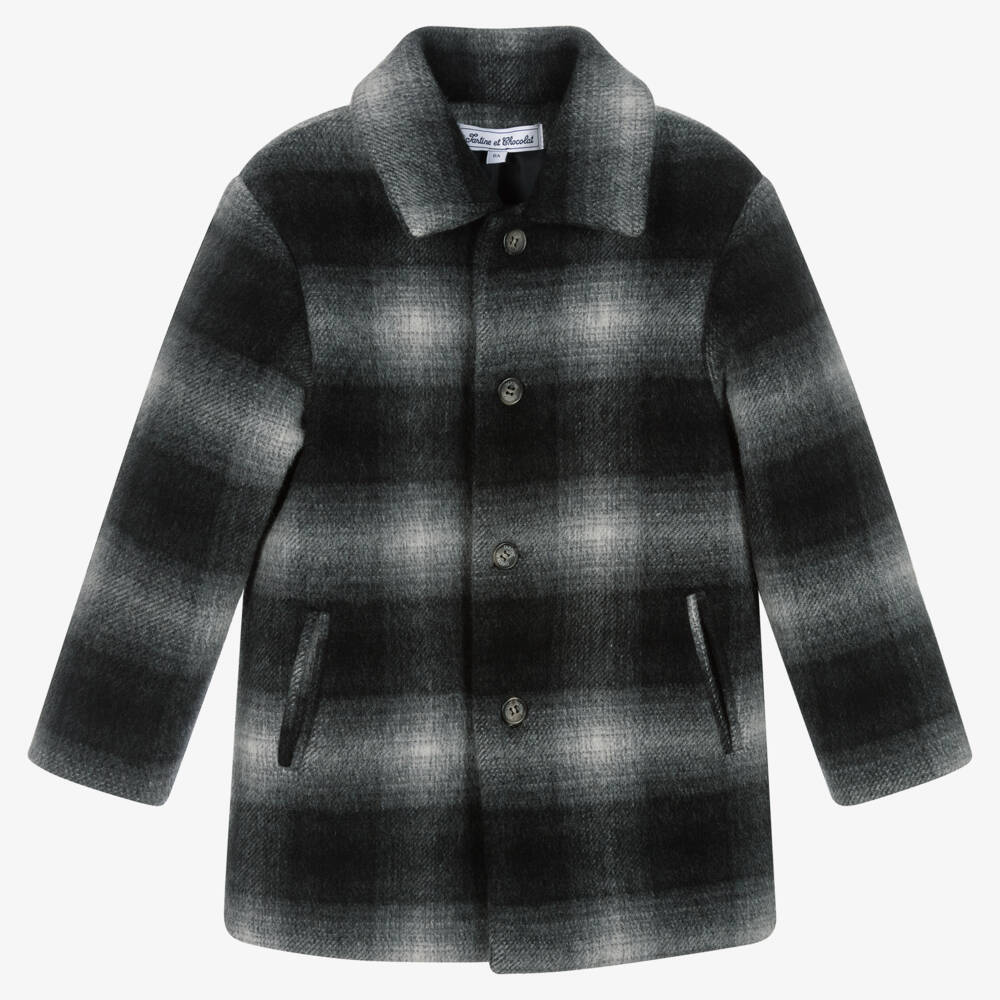 Stylish grey checked coat for boys by Tartine et Chocolat, made in a soft wool blend. Lightly padded, it is warm and cosy, with a lightweight, silky lining. There are front pockets and branded button fastenings.