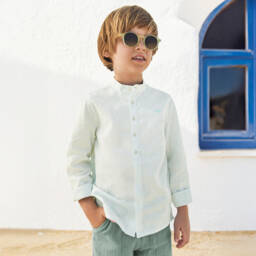 Casual ivory and brown checked shirt for boys by French brand Tartine et Chocolat, made in a soft blend of cotton and Merino wool. With a cosy, brushed feel, this long-sleeved shirt has a blue embroidered logo on the chest and branded button fastenings on the front and cuffs.