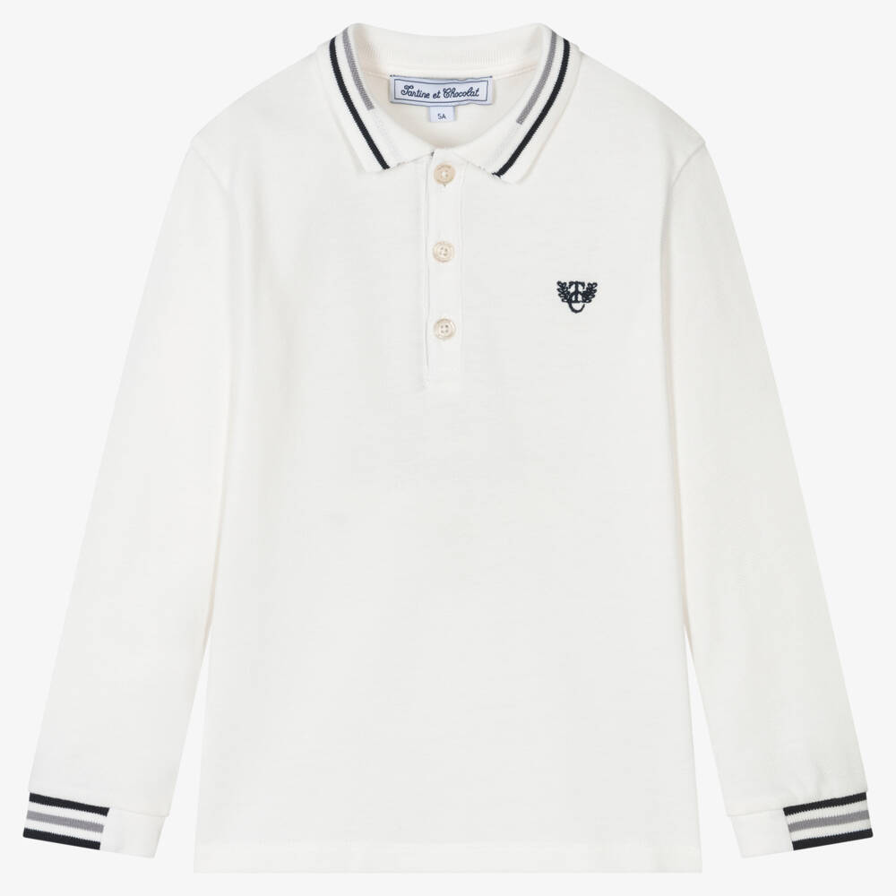 An ivory polo shirt for boys by French brand Tartine et Chocolat, made in soft cotton piqué. Casual and classic, it has a dark blue embroidered logo on the chest, with striped grey ribbed trims. There are pearlescent button fastenings on the front.