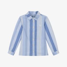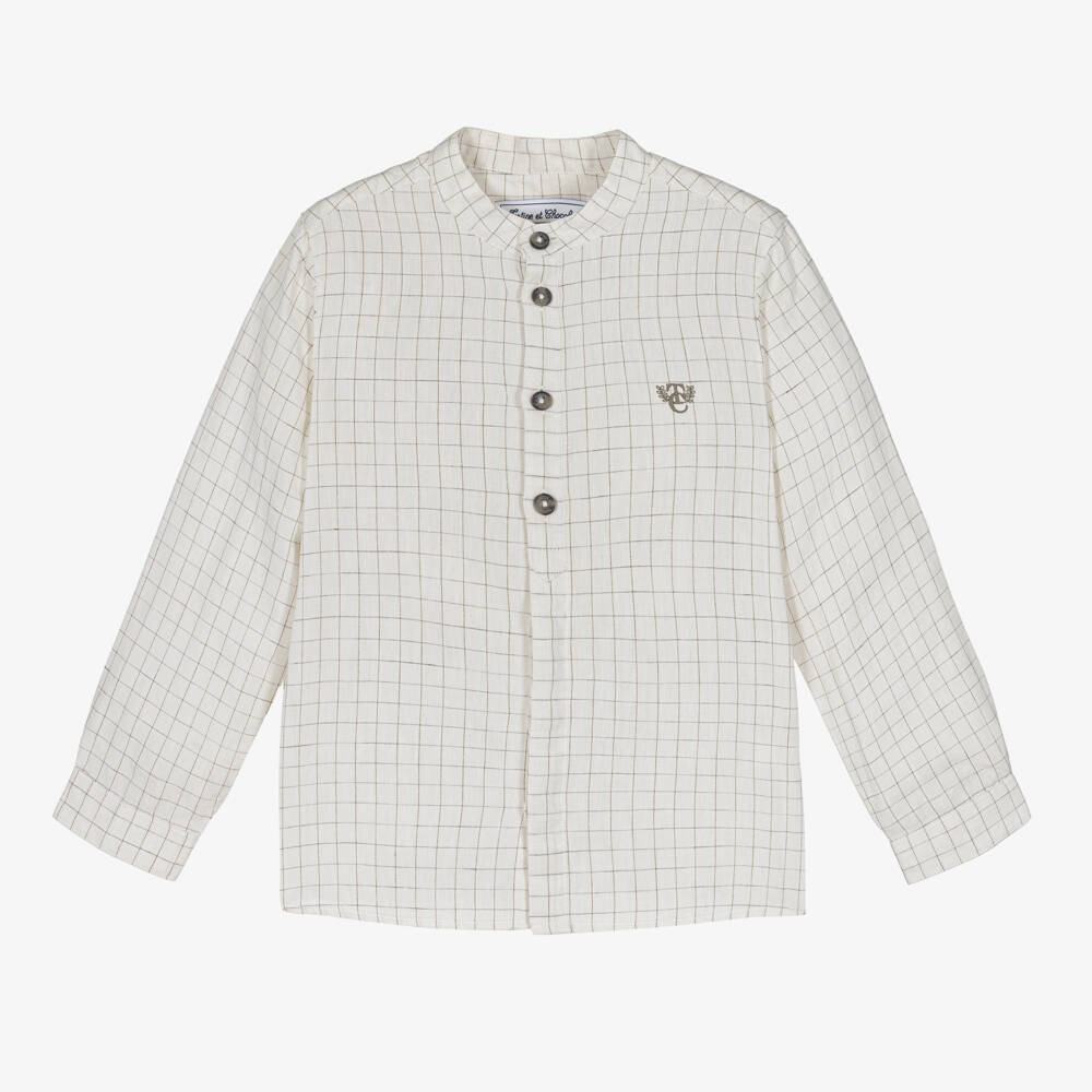 Smart ivory shirt for boys by Tartine et Chocolat. Soft and lightweight, it has a brown check pattern and an embroidered logo on the chest. Cool and comfortable, this stylish collarless shirt has button fastenings on the front.