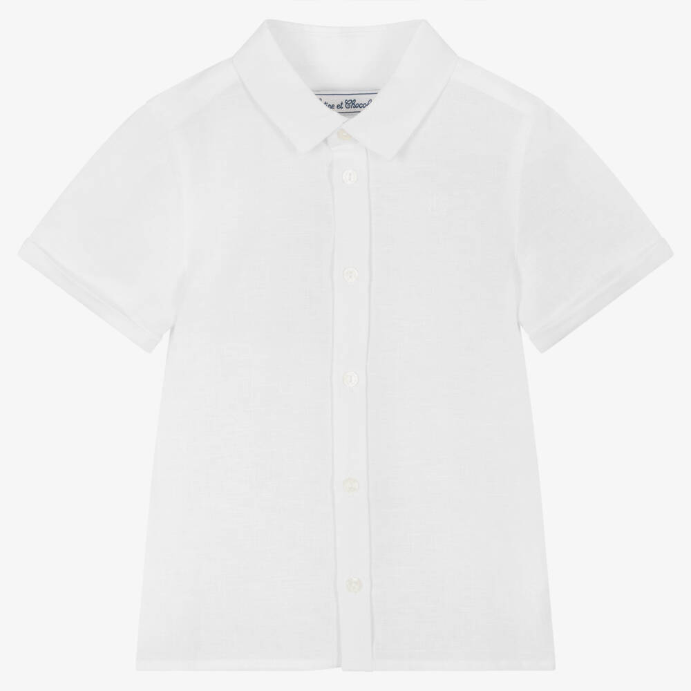 Smart casual white shirt for boys by Tartine et Chocolat, made in soft and lightweight linen. Understated, it has a tonal logo monogram embroidered on the chest and simply button-down on the front with rolled-up short sleeves.