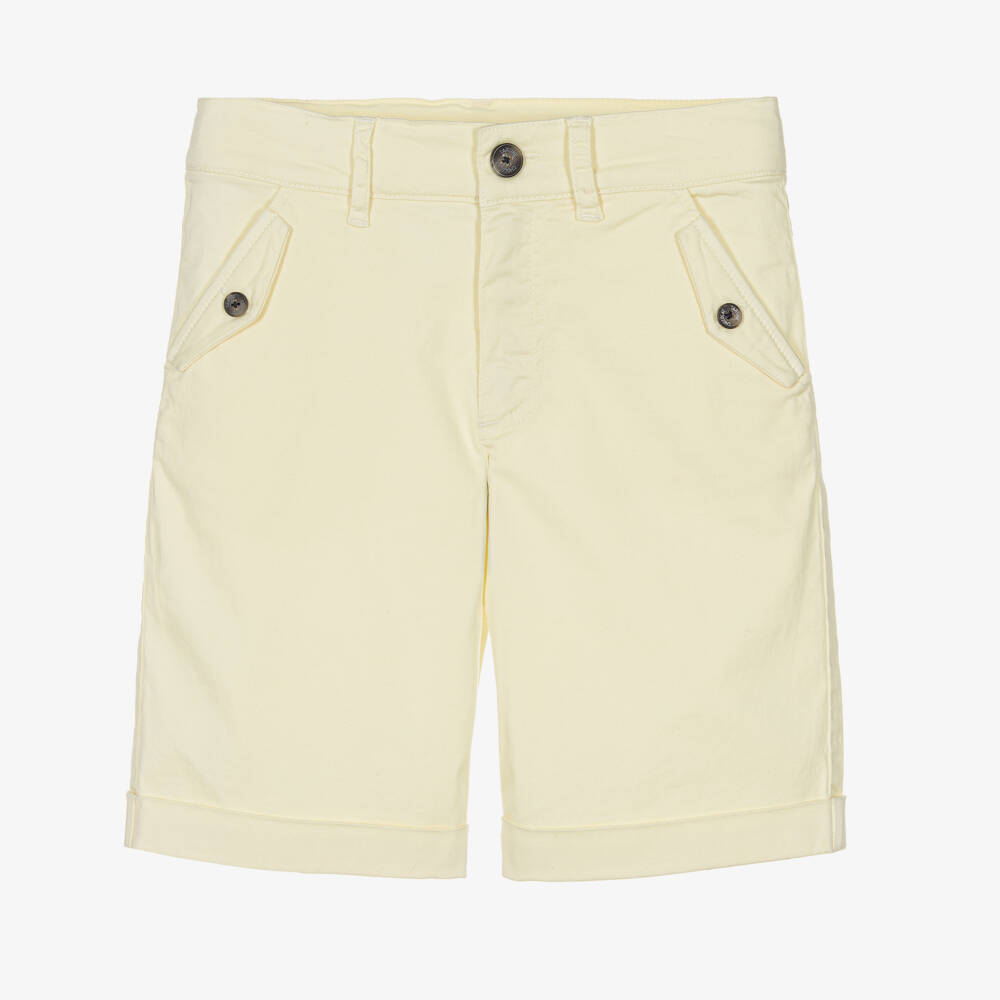Pale yellow chino style shorts for boys by Tartine et Chocolat, made in lightweight cotton twill. They have slanted front pockets, with button trims and a faux back pocket. Casual, yet stylish, they have a zip and button fastening and a useful adjustable waist.