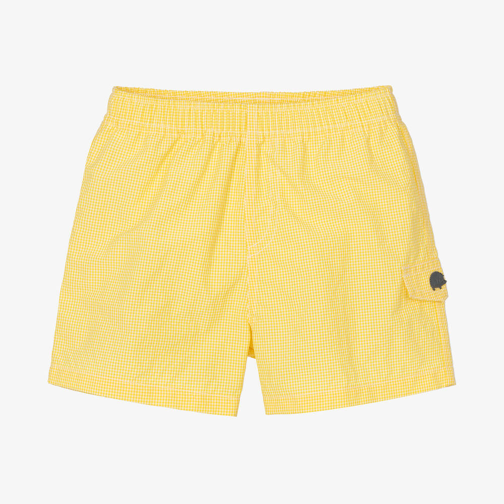 Bright yellow swim shorts for boys by Tartine et Chocolat, made in lightweight fabric with a soft mesh lining. In a small gingham check, these comfortable shorts have an elasticated waistband and a rubberised hedgehog patch on the leg.
