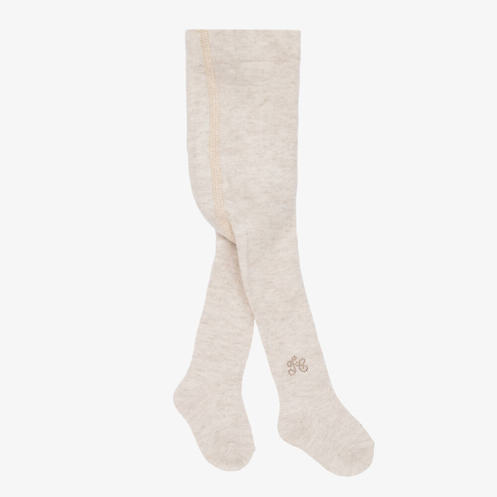 A pair of beige tights for little girls from Tartine et Chocolat, with sparkling gold thread within the knit. So soft and stretchy in a viscose blend, they have an elasticated waist for comfort and a gold diamanté-studded monogram logo on the ankle.