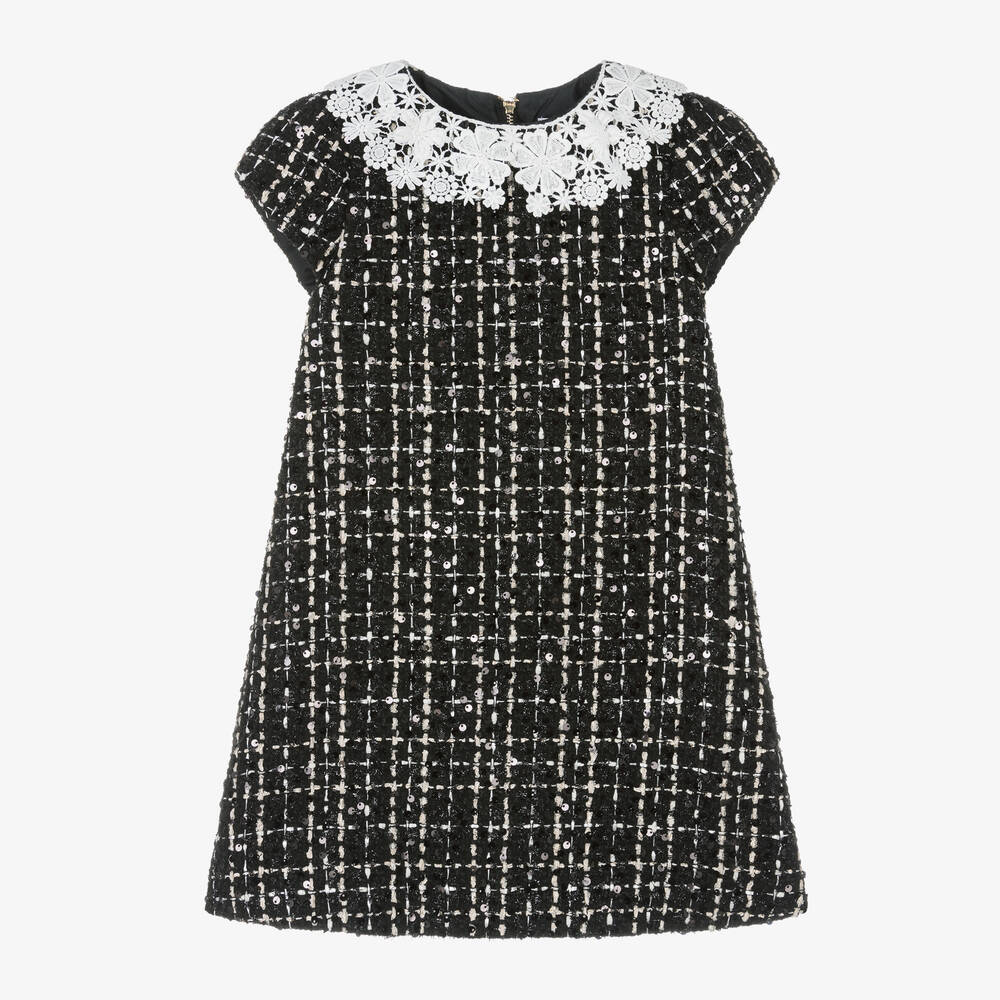 Chic black tweed dress for girls by French label, Tartine et Chocolat. It is made in a soft wool blend, woven with pale gold thread and sparkling black sequins. Designed with an elegant A-line shape and capped short sleeves, the dress has an ivory guipure lace collar for a beautiful finish. It is lined in satin and has a visible gold zip fastening on the back. The designer's gold-tone heart charm is stitched above the hem, completing the look with a discreet branded touch.