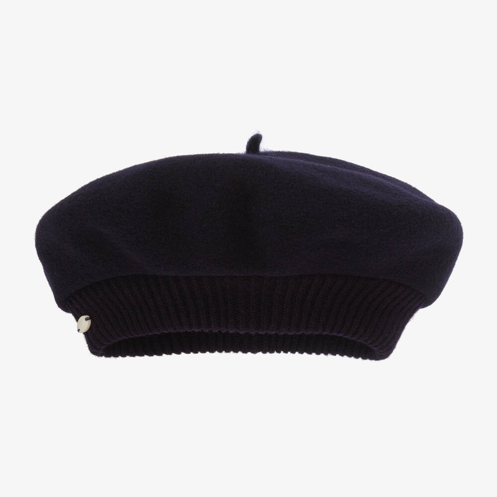 A stylish navy blue beret for girls by French brand Tartine et Chocolat. Cosy and warm, it is made in luxuriously soft felted wool. There is a lightweight cotton lining, patterned in a pretty floral print in blue and green. The knitted ribbed brim is trimmed with a pearlescent branded plate for a subtle designer finish.