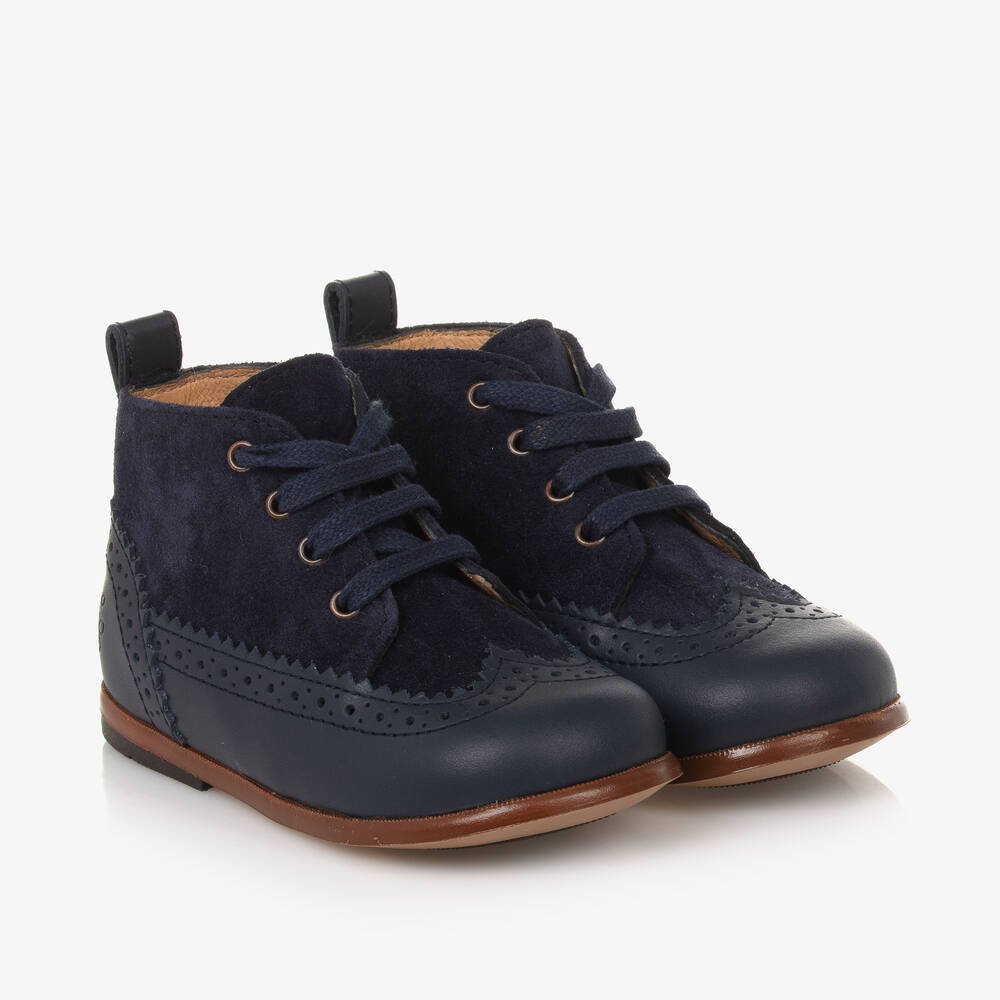 Navy blue leather ankle boots for little girls by French brand, Tartine et Chocolat. They are fully lined in soft leather for comfort and have textured rubber pads on the outsole for improved grips when taking those little steps. These charming lace-up boots have perforated patterns for a classic brogue finish.