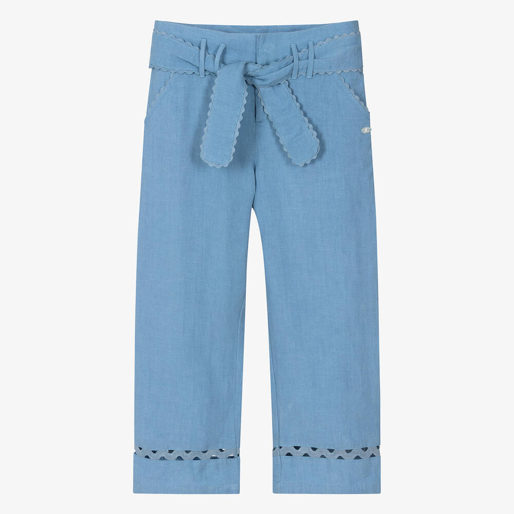 Lovely blue wide-leg linen trousers for girls by Tartine et Chocolate, with pretty ric rac ribbon trims. Soft and lightweight for warmer weather, they have slanted front pockets, cut work detailing on the leg cuffs and a removable tie belt. They fasten with a zip and hook on the adjustable waistband. A little pearlescent logo tab adds a subtly branded feel to this smart casual piece.