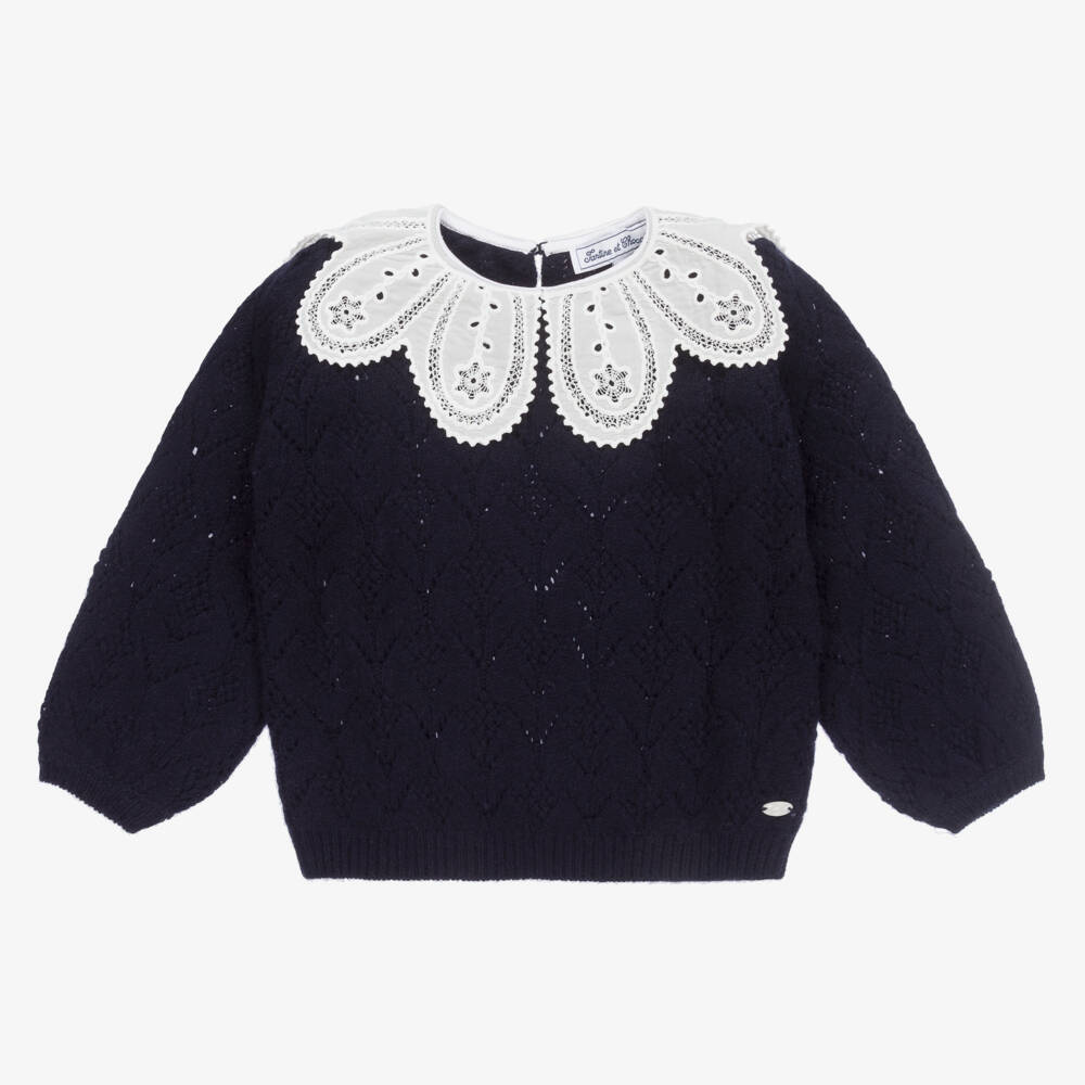 Lovely navy blue sweater for girls by traditional French brand Tartine et Chocolat, knitted in a beautifully soft and warm, wool and viscose blend, with a touch of cashmere. It has a striking, scalloped, crêpe collar with lovely floral embroidery, and a button for easy dressing. The Stylish sleeves are full around the wrists and cosy ribbed trims.