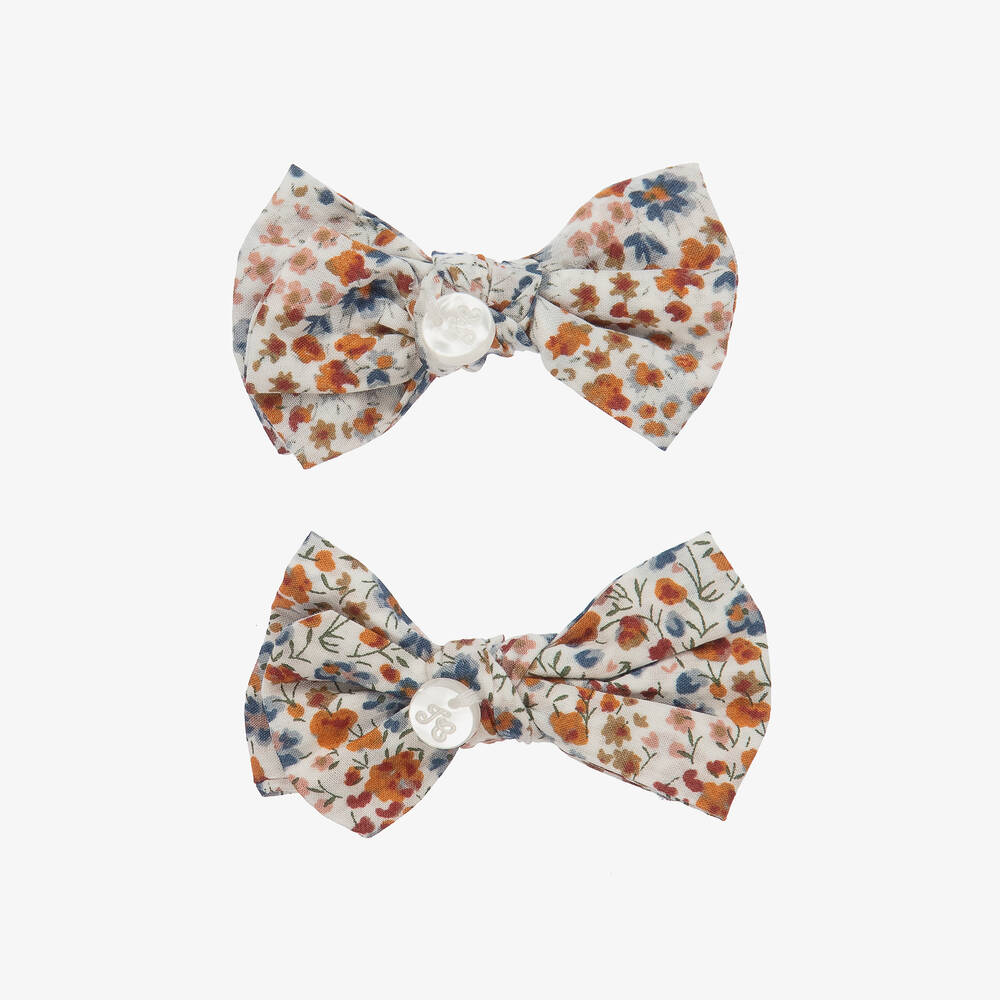 Two bow-shaped hair clips for girls by French label Tartine et Chocolat, in complementary ivory, brown and blue. Made in lightweight cotton and signed with pearlescent charms, these charming, floral-patterned hair clips are set on gold-coloured metal to help them sit securely in her hair.