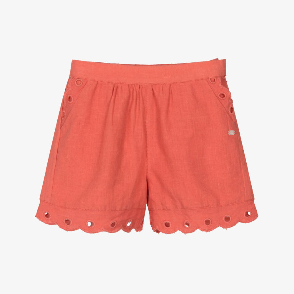 Lovely coral pink shorts for girls by Tartine et Chocolat, made in soft and lightweight linen. Ideal for warmer days, they have slanted front pockets and pretty scalloped trims with embroidered eyelet detailing. The waistband can be adjusted for a comfortable fit and they fasten with a zip on one side.