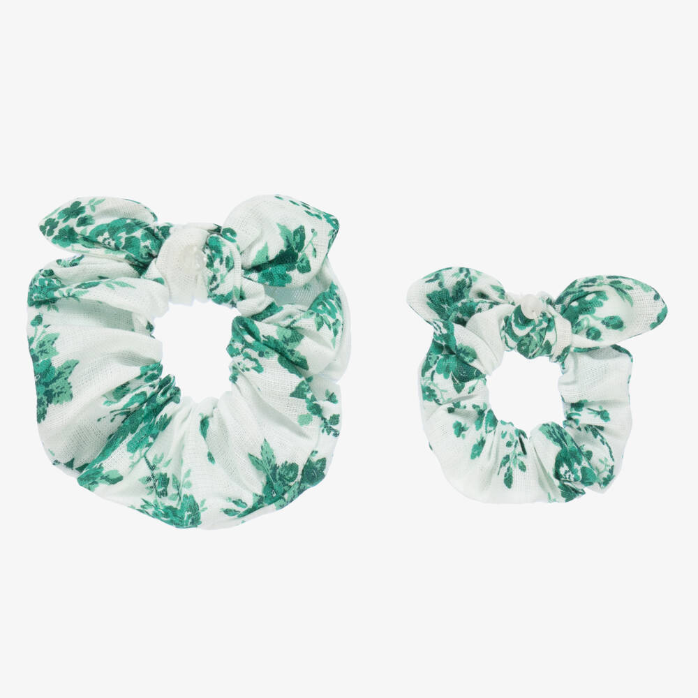 Girls pack of two hair scrunchies by luxury brand, Tartine et Chocolat. Made with soft cotton Liberty® fabric in a delicate green floral print, these elasticated hair accessories have a sweet bow detail across the top.