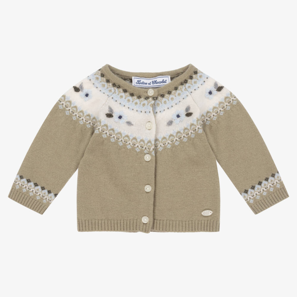 Sage green cardigan for little girls by Tartine et Chocolat, finely knitted in a soft wool blend with a touch of cashmere. Beautifully embroidered with delicate blue florals, this long-sleeved layer has front button fastenings and a pearlized logo charm on the hem. The blue and ivory Fair Isle pattern gives this piece a truly traditional feel.