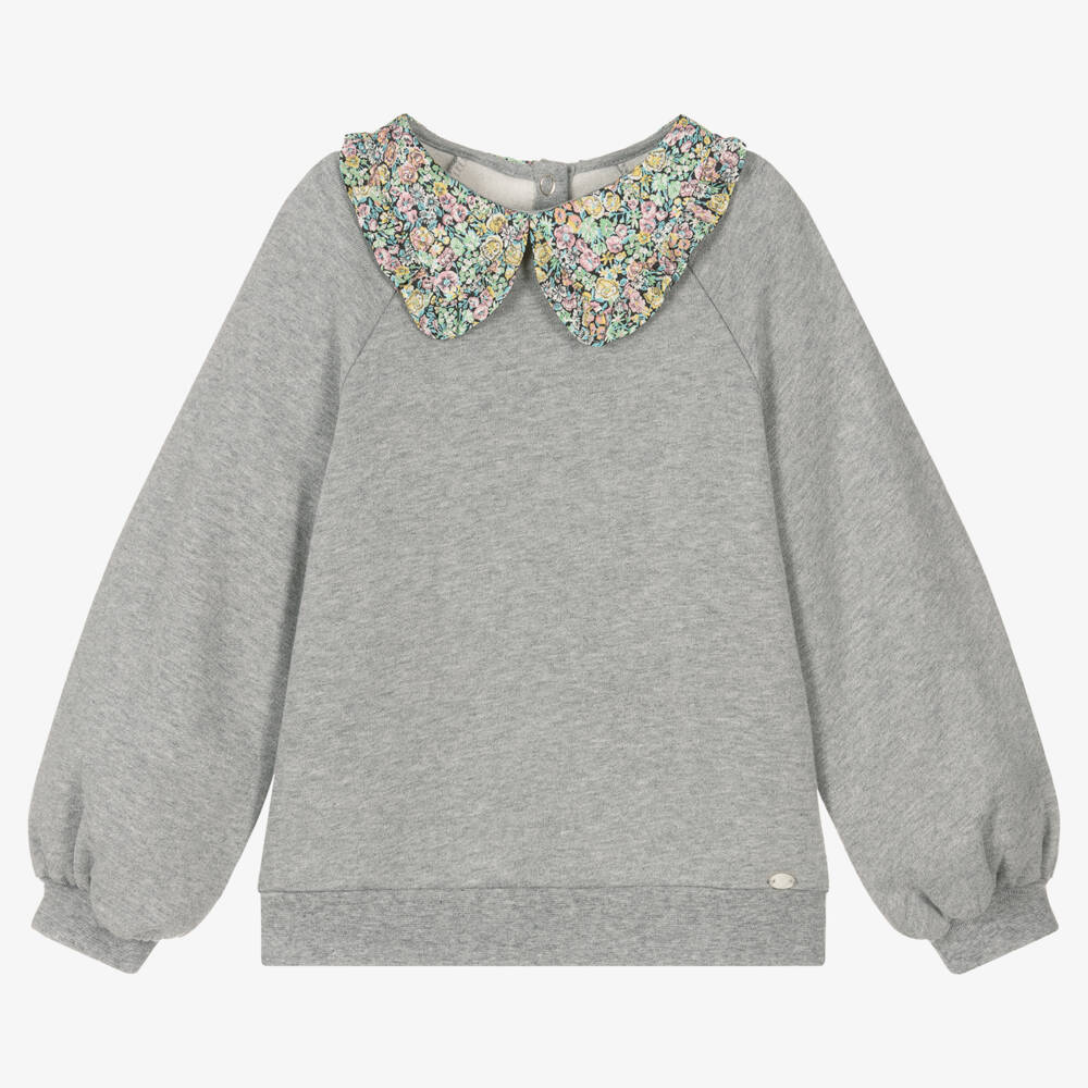 Grey marl sweatshirt for girls by French designer Tartine et Chocolat. Made in soft cotton jersey for effortless comfort, it has a pretty floral collar in a Liberty print for a layered look, and balloon sleeves. It fastens easily with poppers on the back and has a sweet ivory charm sewn near the front hem.
