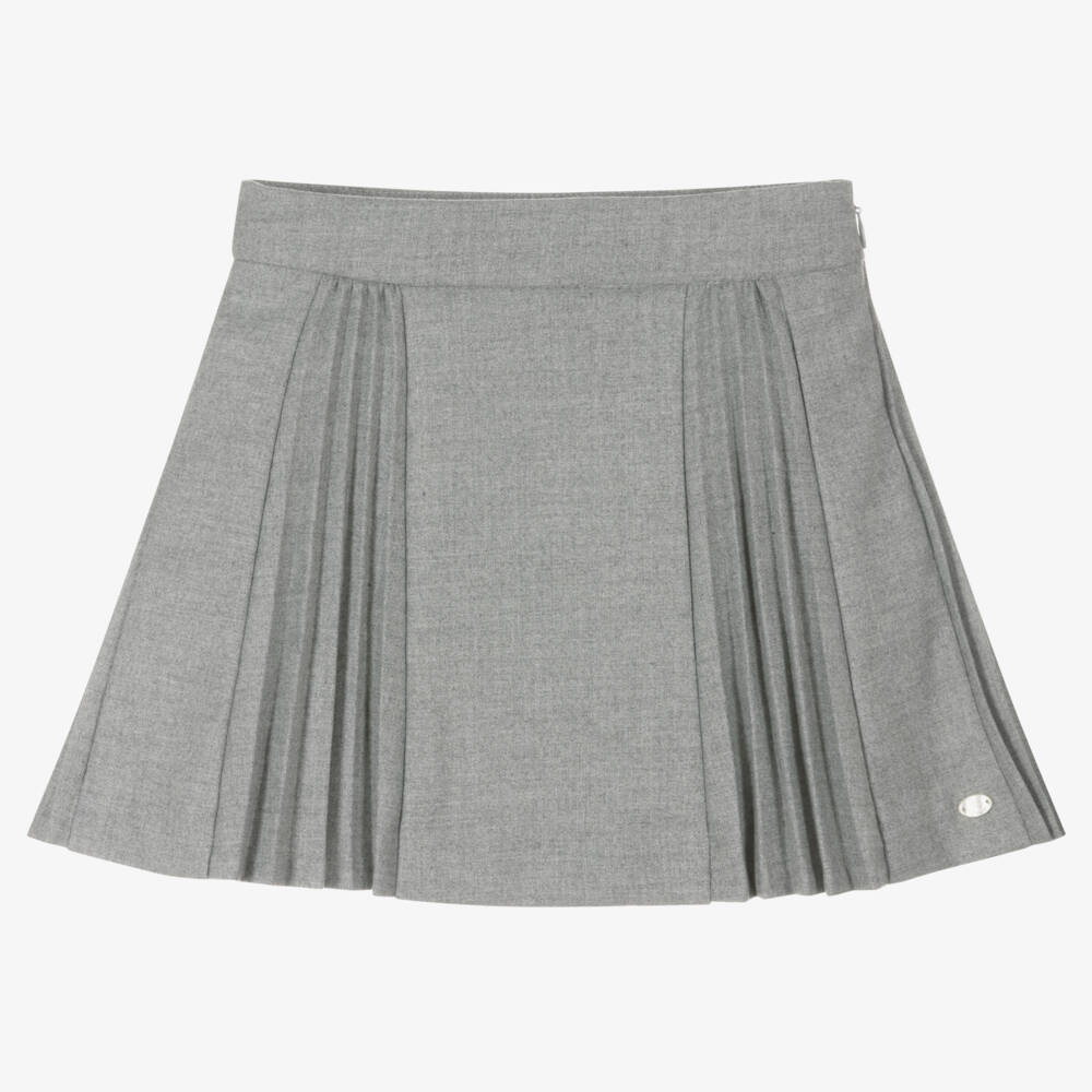 A classic grey pleated skirt for girls from French label Tartine et Chocolat. Softly woven in a brushed viscose blend, this smart style is signed with a pearlescent logo charm on the hem. In an elegant flared silhouette, it has a neat zip hidden on one side, a silky jacquard lining, and an adjustable waist for the ideal fit.