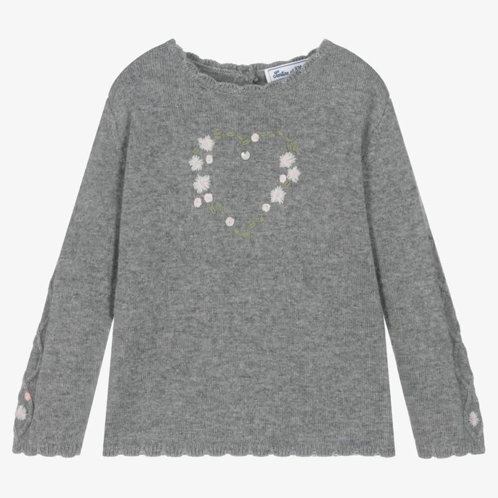 Gorgeous grey marl sweater for little girls by classic French designer Tartine et Chocolat, with a lovely, hand-embroidered, floral heart on the front and a central logo charm. Made in a beautifully soft, warm, wool, cashmere and viscose blend, it has cable stitching on the sleeves with more hand embroidery above the cuffs. The cosy ribbed trims are prettily scalloped and the back button fastenings are engraved with logos.