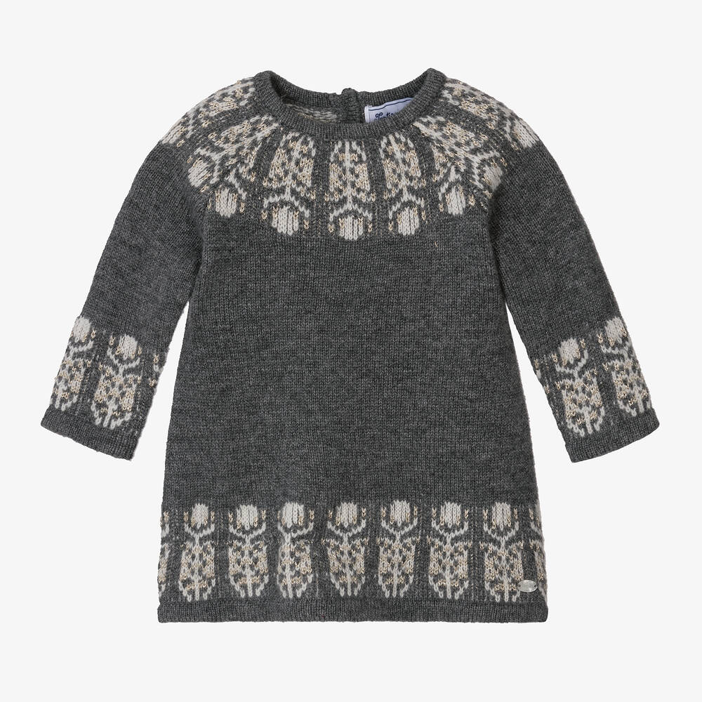 Grey sweater dress for younger girls from Tartine et Chocolat, knitted in a luxurious wool and cashmere blend. It is simply styled with long sleeves and beautifully patterned with an ivory and sparkly gold motif. There are branded buttons to fasten on the back of the neckline.