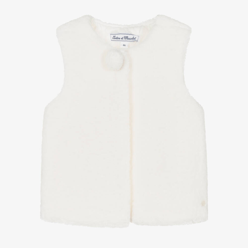 Ivory gilet for girls by Tartine et Chocolat, made in soft, faux fur. It fastens with a popper on the front, with a bobble over the top and is lined in silky satin.