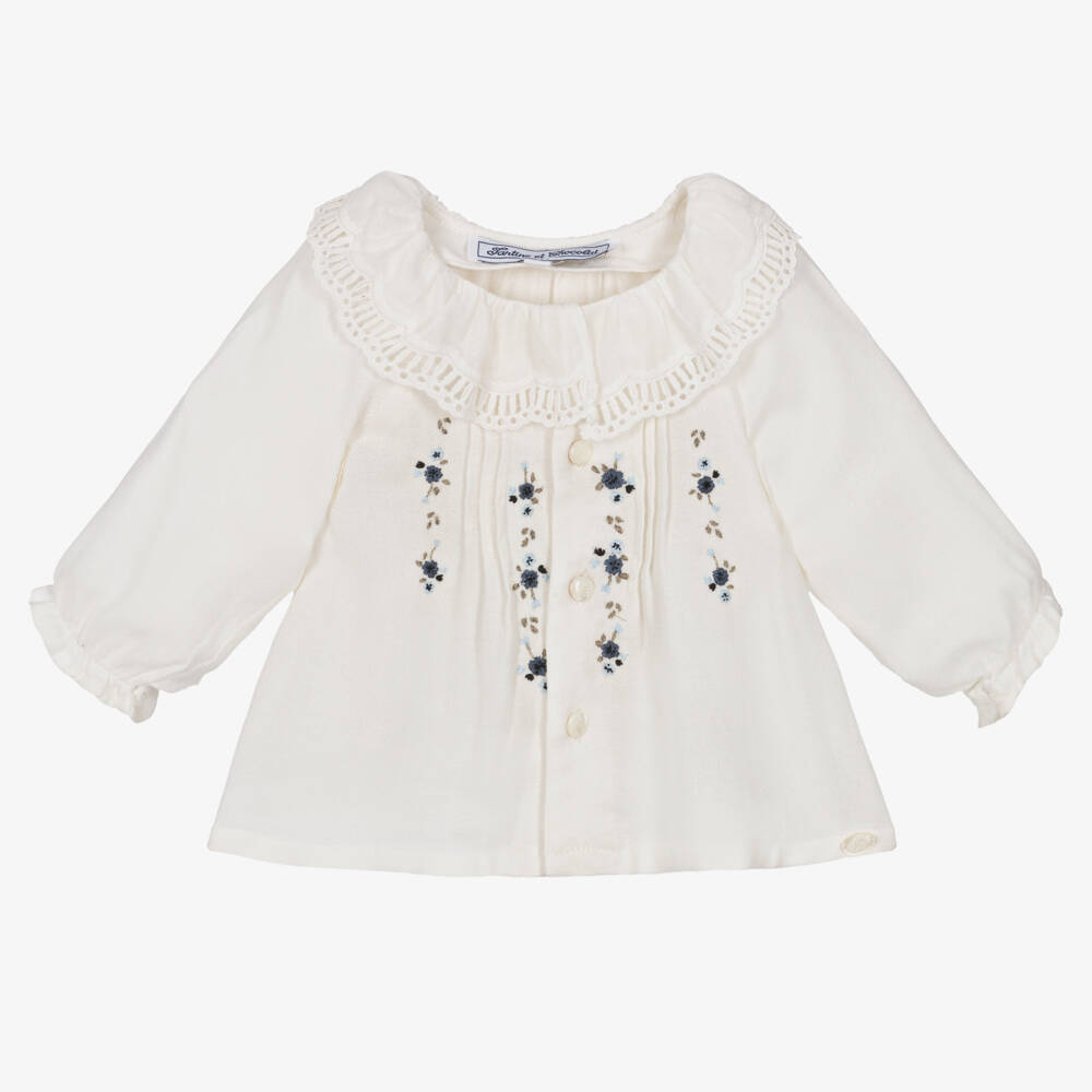 An ivory blouse for little girls by French brand Tartine et Chocolat, woven in beautifully soft viscose. This elegant top has a frilly lace-trimmed collar, pintucks and blue hand-embroidered flowers. The front fastens with pearlescent buttons and the sleeves are delicately elasticated. A pearlescent logo charm is featured on the hem.