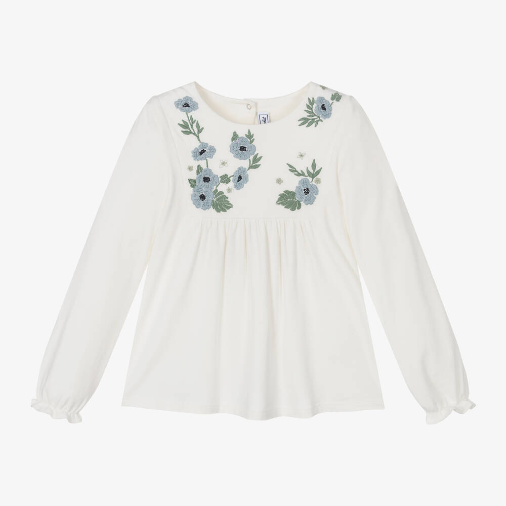 Stylish yet comfortable, this ivory long-sleeved top for girls by classic French brand Tartine et Chocolat, is made in soft and stretchy cotton-blend jersey. Beautiful floral embroidery in blue and green is just right for elevating her casual looks. Gathered for a flared silhouette, it has elasticated ruffle cuffs and fastens with poppers on the back.