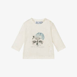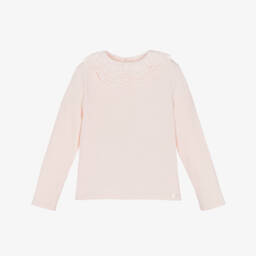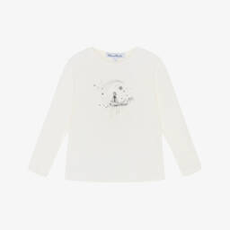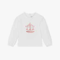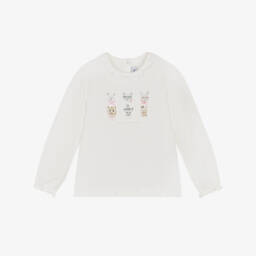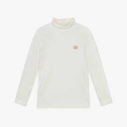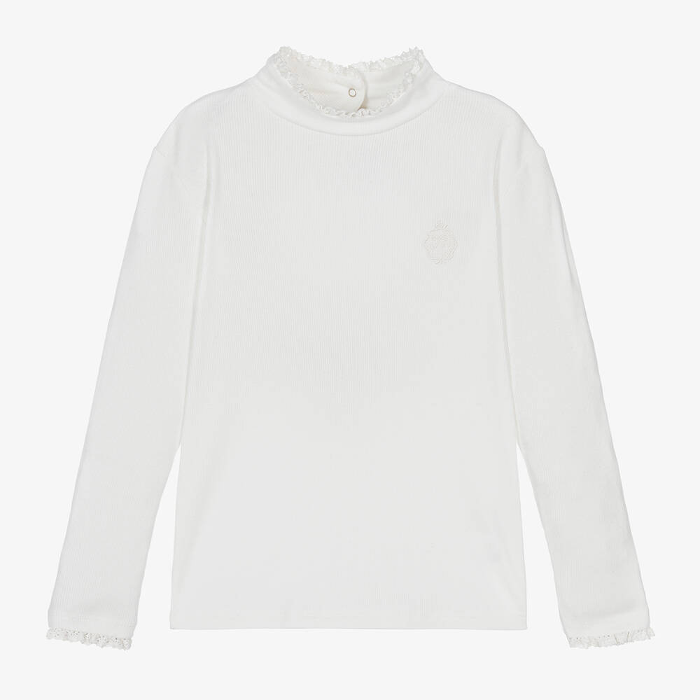 Lovely ivory long-sleeved top for girls by Tartine et Chocolat, made in super soft cotton jersey. The high neck has pretty knitted lace trim to match the cuffs and a tonal crest logo is stitched on the chest. Finely ribbed for a comfortable fit with popper fastenings on the back of the neck, it can be worn on its own or layered for a cosier look.