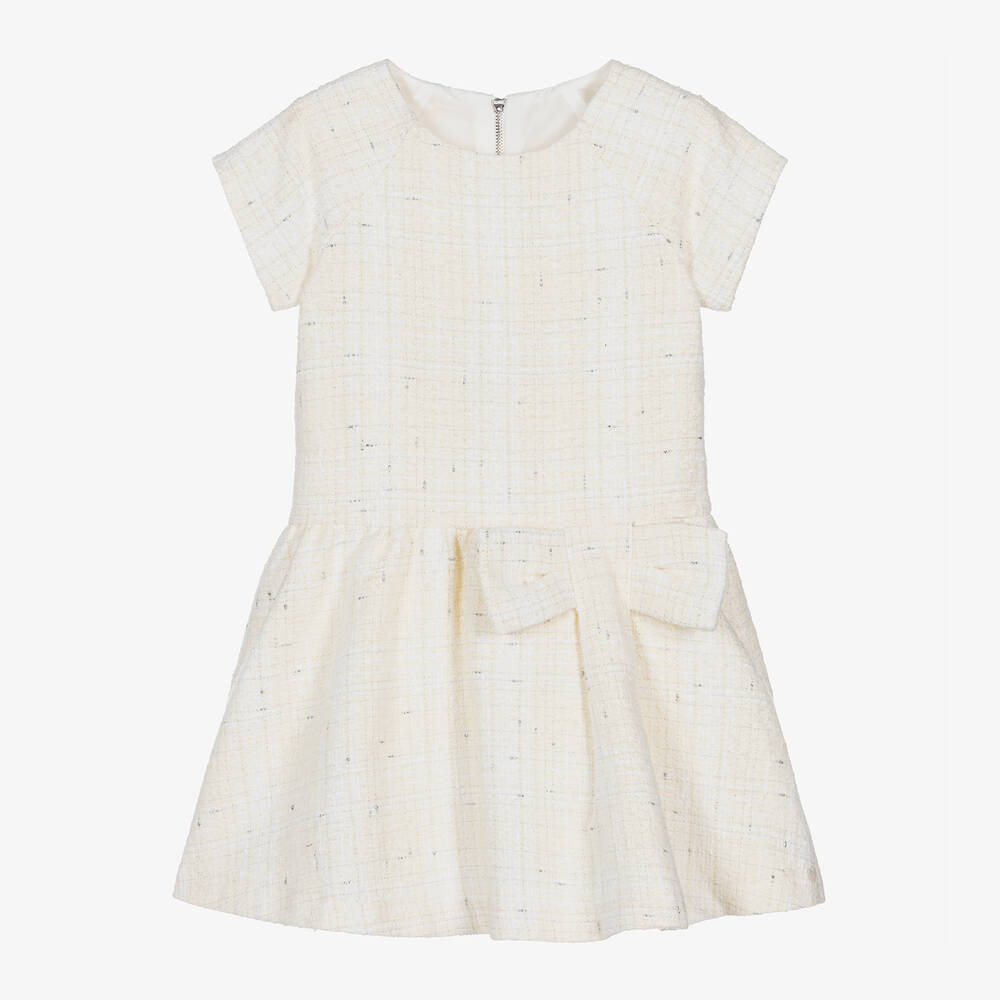 Lovely ivory dress for girls by French brand, Tartine et Chocolat. It is made in a soft cotton and wool blend tweed, with a hint of silver thread in the weave for a gentle sparkle. Effortlessly chic, it is simply designed with capped short sleeves, a round neckline and a dropped waist with an elegant bow on the front. It is fully lined and fastens with a silver zip on the back.