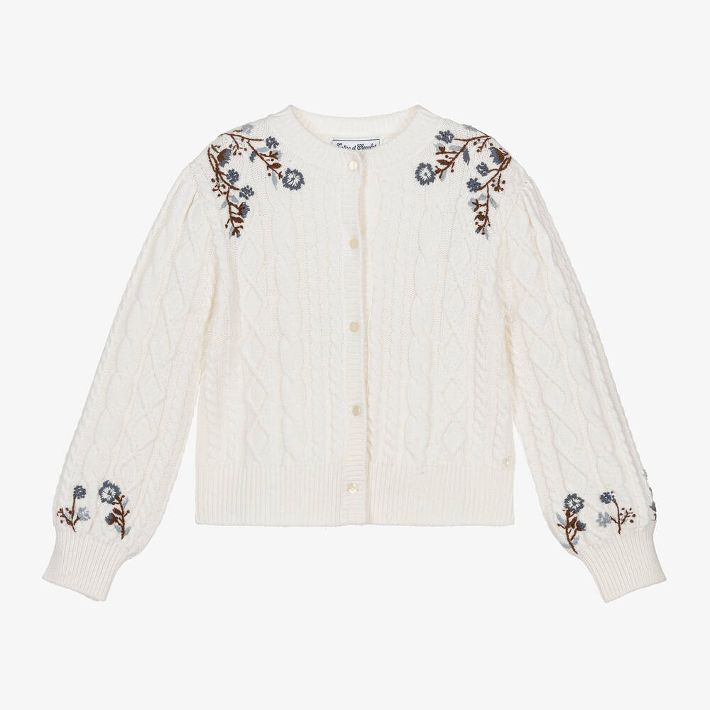 Lovely ivory cardigan for girls by classic French brand Tartine et Chocolat, with beautiful blue and brown floral hand embroidery. Knitted in a super soft wool, viscose and cashmere blend, it has a cable pattern, prettily puffed, long sleeves and cosy ribbed trims. There are pearlescent button fastenings on the front and a heart-shaped logo charm sewn by the hemline.