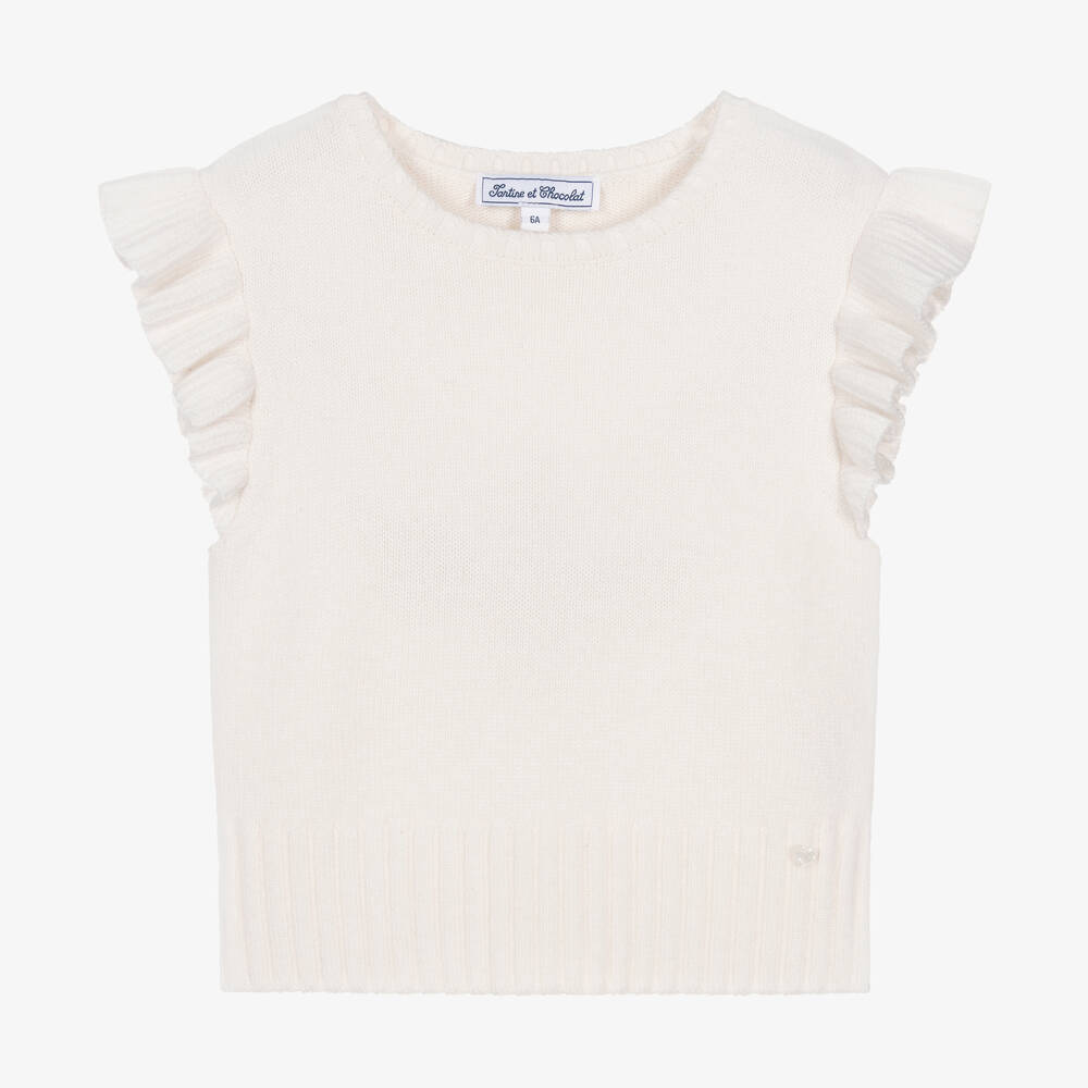 Lovely ivory slipover top for girls by French designer Tartine et Chocolat. Beautifully soft and cosy, i is knitted in a wool and cashmere blend, with frilly, ribbed trims over the shoulders. A pearlescent, logo heart charm is stitched by the ribbed hem for a cute, branded touch.