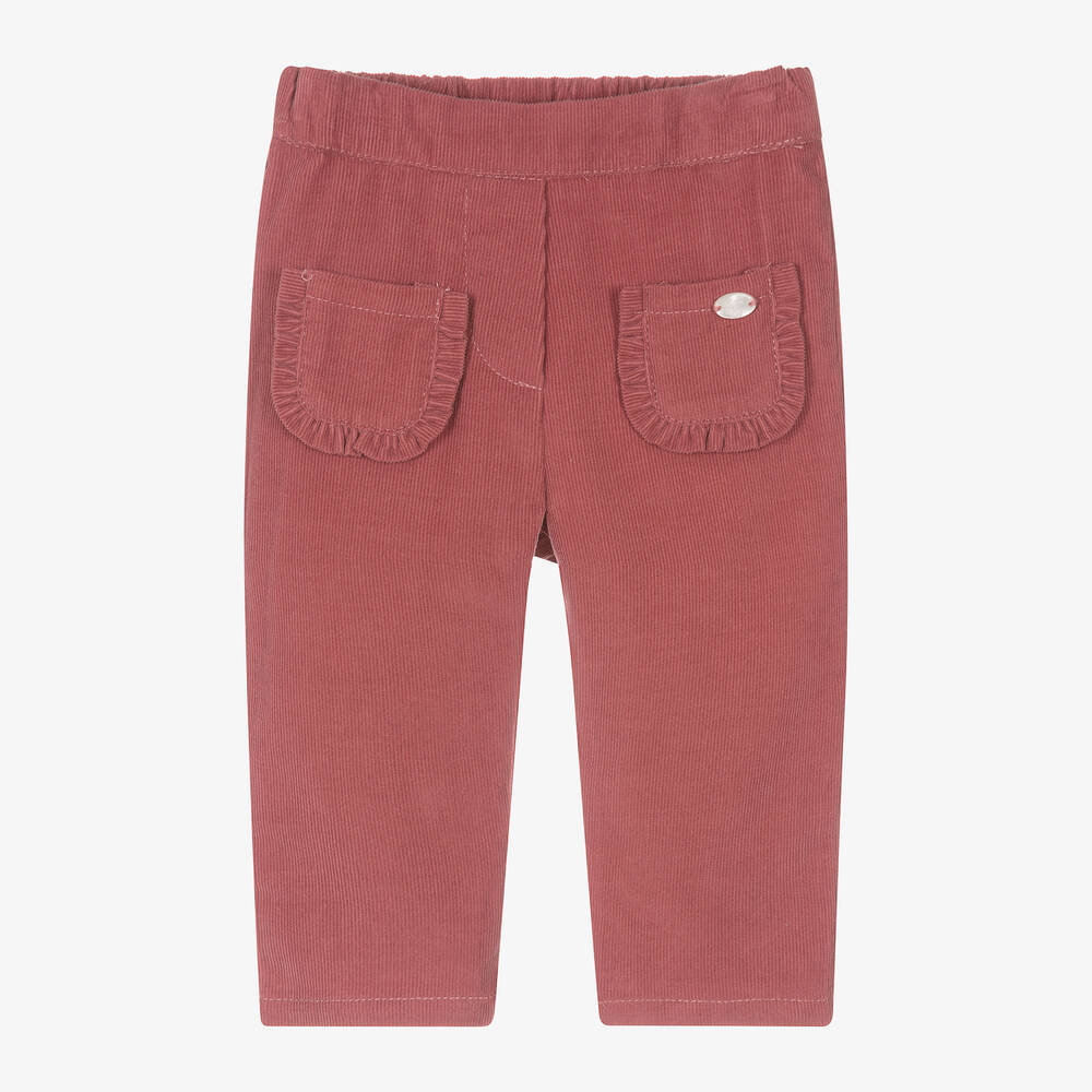 Pink cotton trousers for younger girls by Tartine et Chocolat, made from soft, fine needlecord. This comfortable style has little ruffle-trimmed patch pockets on the front , with a pearlescent logo charm for a discreet designer touch. Easy to pull on, they have an elasticated waistband that is adjustable for a comfortable fit.