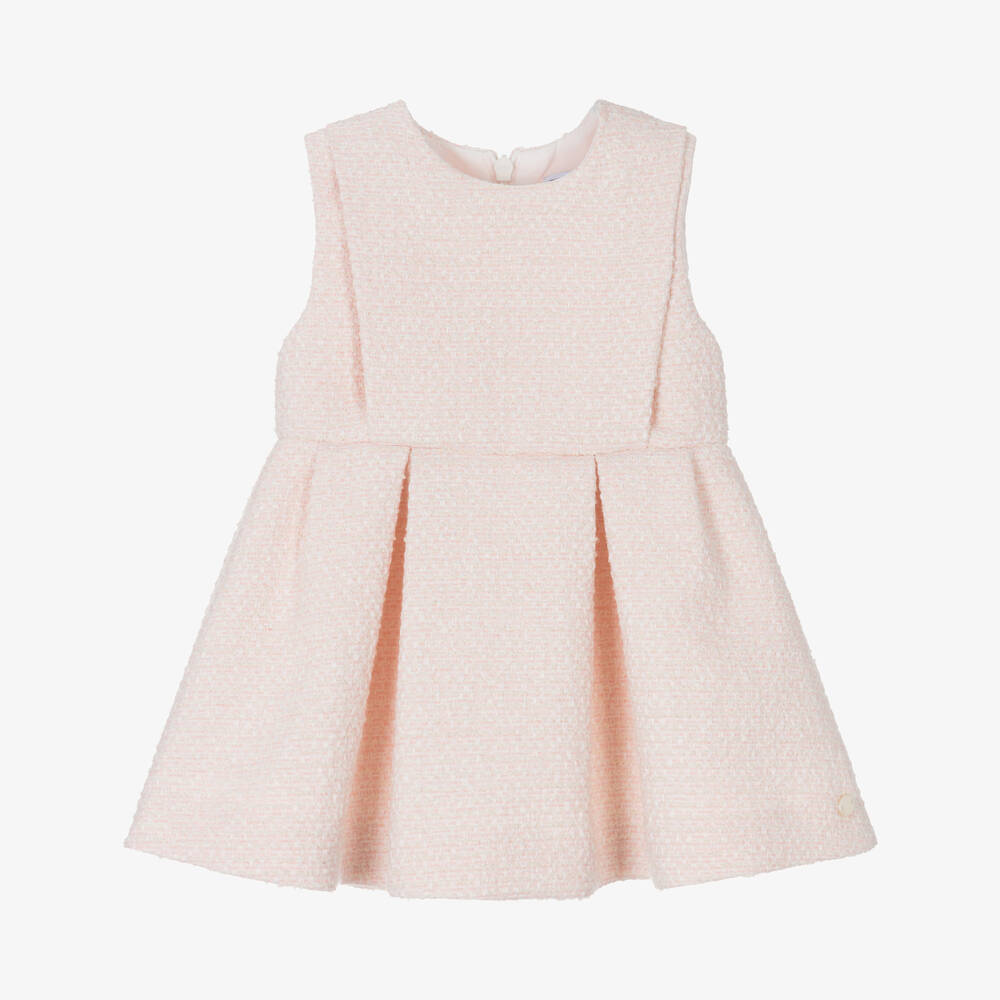 A chic pale pink tweed dress for little girls by Tartine et Chocolat, lovely for special occasions. Timeless and elegant, this sleeveless dress is made in cotton-blend French tweed and designed with box-pleating on the skirt. With a silky full lining for comfort, it has a subtle logo charm above the hem and a neat, hidden zip on the back.