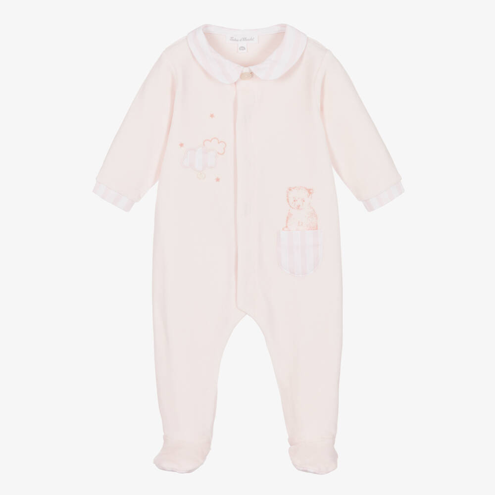 Cute pink cotton babygrow for girls by traditional French brand Tartine et Chocolat, made in super soft velour. It has a pink and white striped poplin collar, with a matching chest pocket and cloud appliqué on the front. A sweet bear sits in the pocket, whilst stars are printed around the cloud, with a logo charm sewn below. The babygrow has coordinating, striped trims on the buttoned cuffs and the soles of the feet. There are easy-to-use popper fastenings on the front and between the legs for easy dressing.
