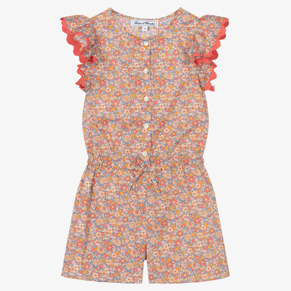 Charming pink playsuit for girls from luxury brand Tartine et Chocolat, made in soft Tana Lawn™ cotton. Patterned with a beautiful floral Liberty print, with hues of orange and blue throughout, this playsuit stands out in a crowd. It is delicately finished with tonal ric rac trim on the ruffled sleeves and pearlised button fastenings on the front.