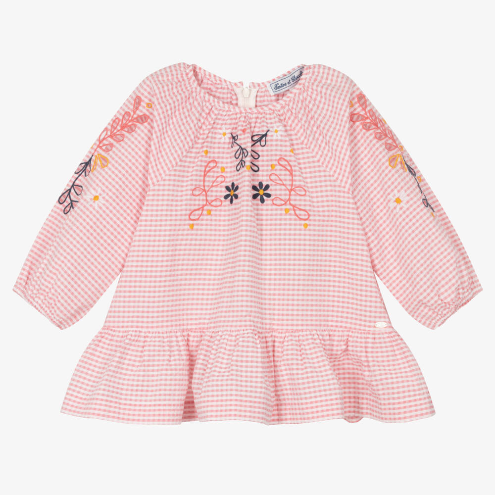 Pretty pink and white gingham blouse for girls by Tartine et Chocolat, made in textured seersucker. It has long puff sleeves and a flared bottom for volume. There are embroidered floral patterns on the chest and sleeves, with cut out sections on the arms, adding a quirky finish. For easier dressing there is a concealed zip fastening on the back.