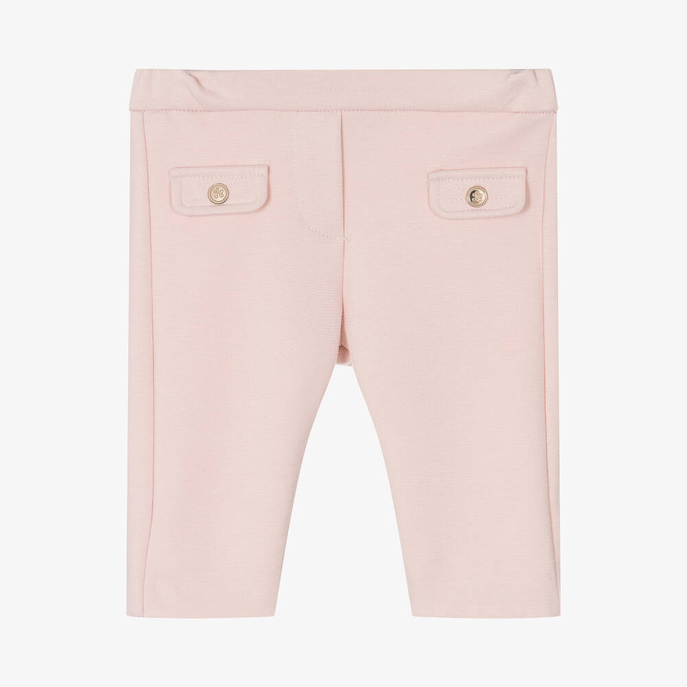 Light pink trousers for little girls by Tartine et Chocolat, made in soft, stretchy and mid-weight jersey. An elegant, heritage look, these smart trousers have faux pockets with golden logo-engraved motifs. Making dressing simple, the waist is elasticated around the back and adjustable with inner buttons for comfort.
