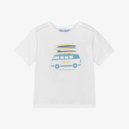 Light pink top for girls by Tartine et Chocolat, knitted in soft cotton material. Styled with a high collar, this short-sleeved top has ruffled trims and pearlescent button fastenings on the neckline.