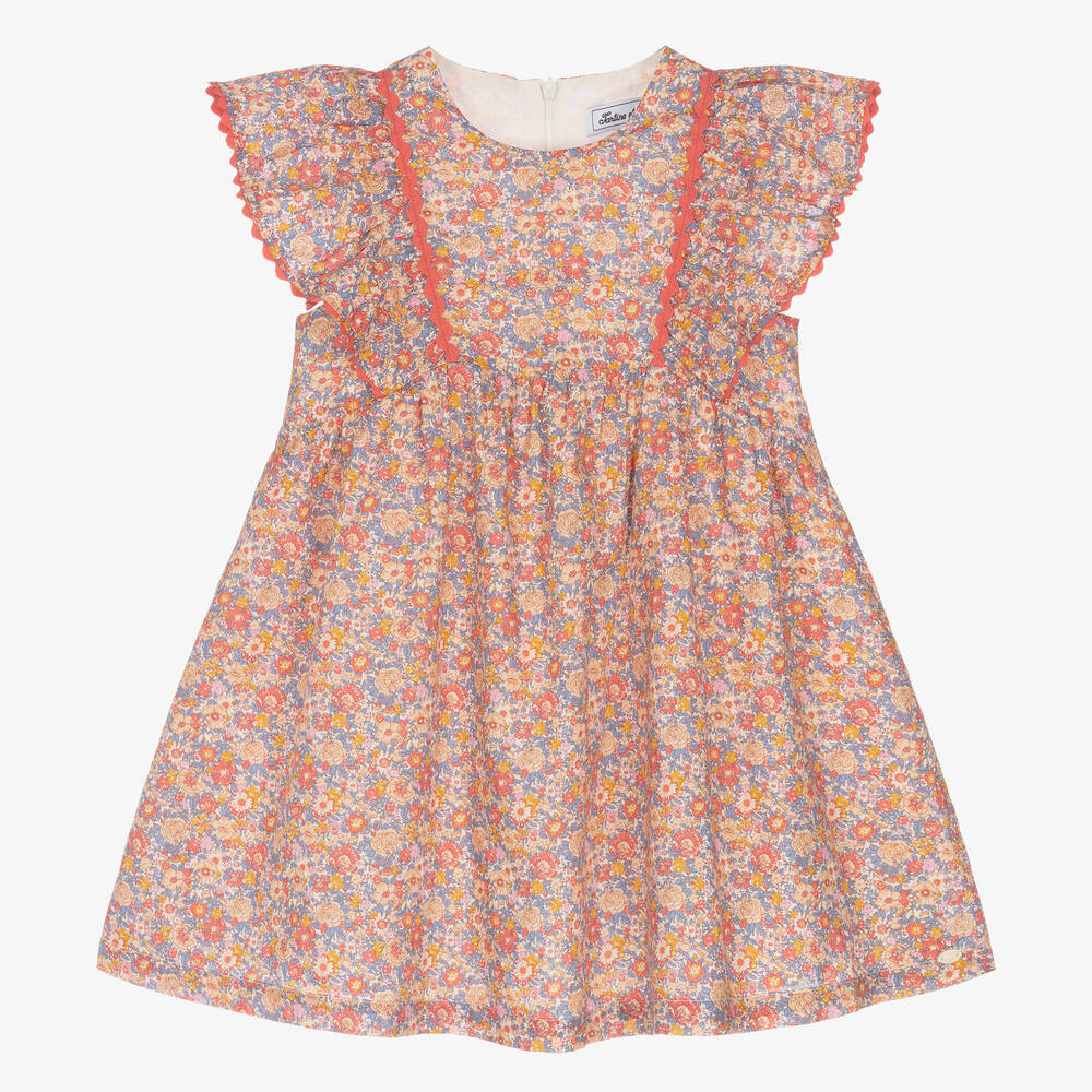 Lovely dress for girls from luxury brand Tartine et Chocolat, made in pink floral Liberty print Tana Lawn™ cotton. The pretty design creates a soft shape with volume and movement in the skirt. The sleeves are ruffled and trimmed with ric rac, which is also stitched on the chest and back, for a classic look. A concealed zip fastening on the back gives a neat finish.