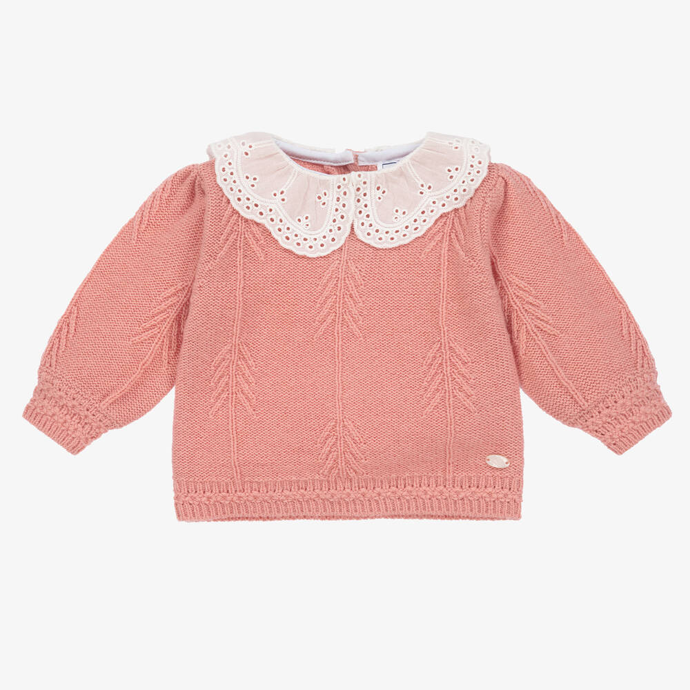 Pink sweater for little girls by Tartine et Chocolat, knitted in a soft wool blend with a touch of cashmere. Patterned with arrowhead stitch detailing, this classic style has a beautifully embroidered eyelet collar for a contrast in textures. There are button fastenings on the back and a pearlized logo charm sewn on the hem.