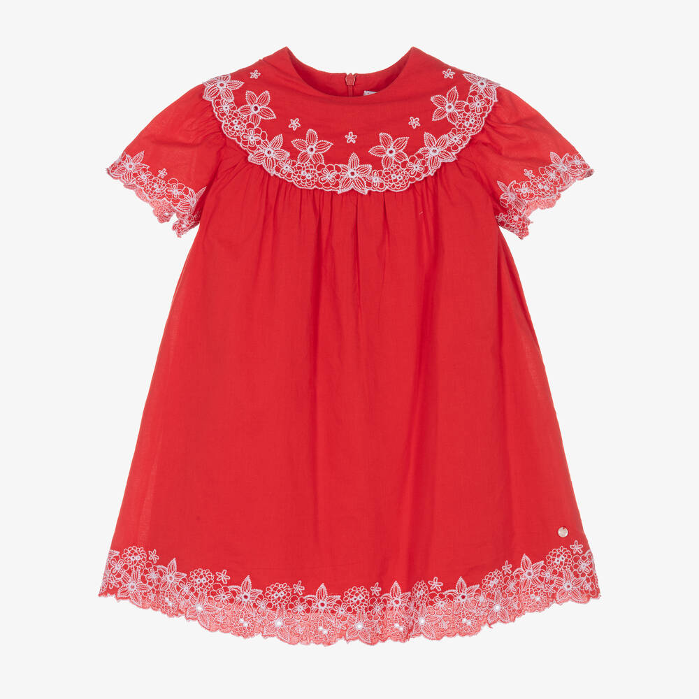 Pretty red cotton dress for little girls by traditional French brand Tartine et Chocolat. Beautifully embroidered with delicate white flowers on the collar, sleeves and hemline, this soft and lightweight dress is fully lined for comfort. Delicately gathered for a relaxed silhouette, the dress fastens easily with a concealed zip on the back for a neat finish.