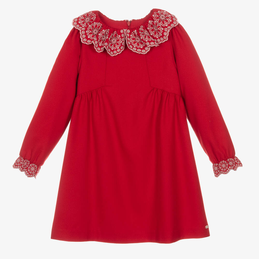 Vibrant red festive dress for girls by Tartine et Chocolat, made in soft twill, with a brushed feel. It has a logo tab above the hem and lovely broderie anglaise trims on the oversized collar and cuffs. It fastens with a zip on the back and has a lightweight cotton lining.