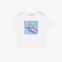 A lovely white cotton T-shirt for girls from Tartine et Chocolat, with ruffled flutter sleeves. The front has an array of printed and appliqué bows in different shades of blue for a cute look.