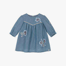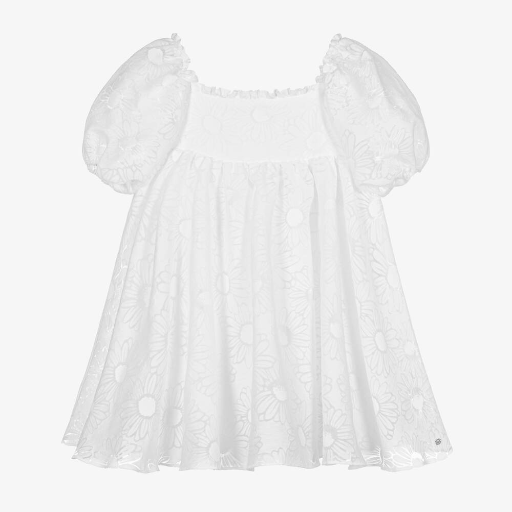 Beautiful white dress for girls by Tartine et Chocolat, made in luxurious lightweight cotton with a sheer daisy pattern. Ideal for a special occasion, it has sheer puff sleeves, a square neckline with a ruffle trim and a full skirt. Fully lined in lightweight voile, with soft tulle layers for added volume, it has a concealed zip fastening on the back and a silver logo charm by the hem.