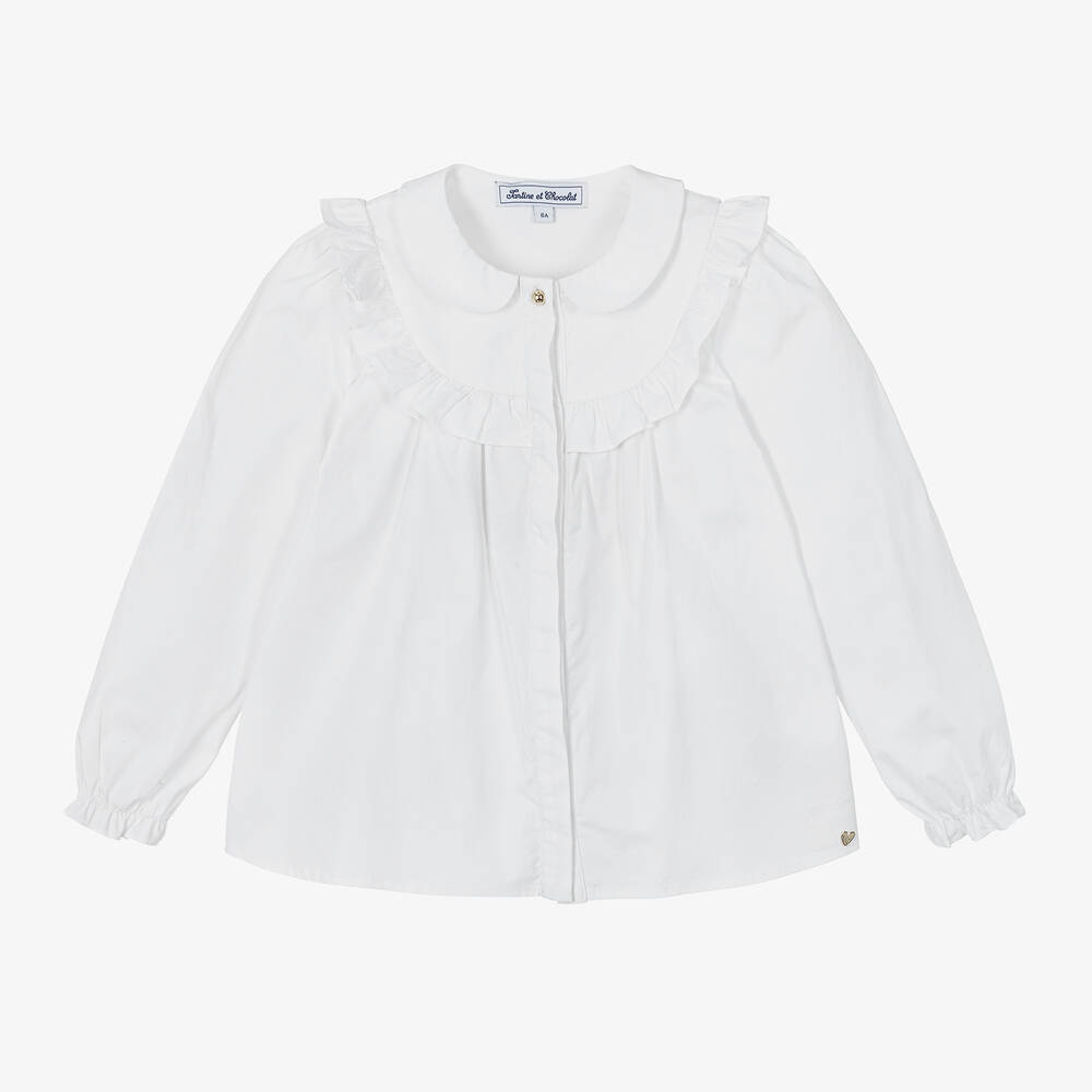 White blouse for girls by French brand Tartine et Chocolat, made in soft, smooth cotton poplin with added stretch. It has a rounded collar and ruffle trim. The long sleeves have elasticated cuffs and there is a gold metal heart-shaped logo charm by the hem for a discreet designer finish. This smart-casual blouse has concealed button fastenings on the front and a shiny gold button at the neck.